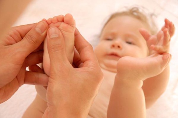 Massage từ gót lên đến ngón chân bằng ngón tay cái. Sau đó sử dụng lòng bàn tay massage phần dưới và trên cùng của chân bé. Từ từ, tạo vòng tròn bằng ngón tay cái của bạn ở cuối mỗi chân và sau đó đến các ngón chân.